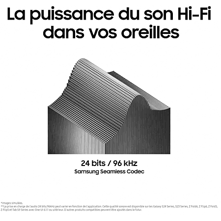 Profitez d’un son d’excellente qualité sur vos Galaxy Buds3. Le Samsung Seamless Codec (SSC) est capable de supporter des formats jusqu’à 24bit et 96kHz, pour un son riche et rempli de détails.